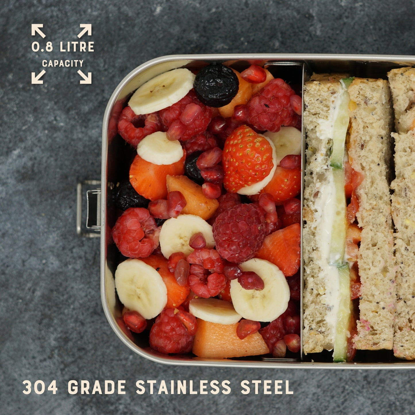 Embrace sustainability with our 800ml stainless steel lunch box! Made from premium, BPA-free 304-grade stainless steel, it's safe, durable, and eco-friendly. Secure clips and a tight silicone seal prevent spills, while a removable divider lets you pack meals your way - perfect for snacks, salads, or sandwiches. Compact yet spacious (13.5cm x 17.5cm x 6.2cm), it’s ideal for school, work, picnics, or camping.