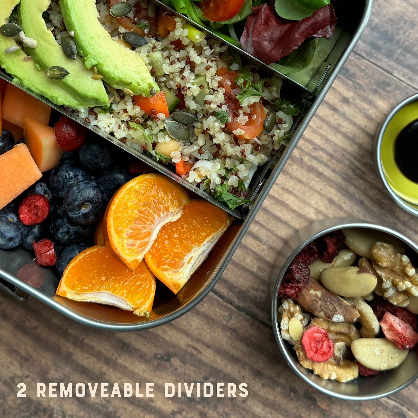 Our largest 1.4L stainless steel lunch box lets you pack multiple meals with ease, thanks to two removable dividers for ultimate meal flexibility. The 150ml snack pot can be used inside or outside the lunch box, for snacks, sauces, fruit, veggies and much, much more!