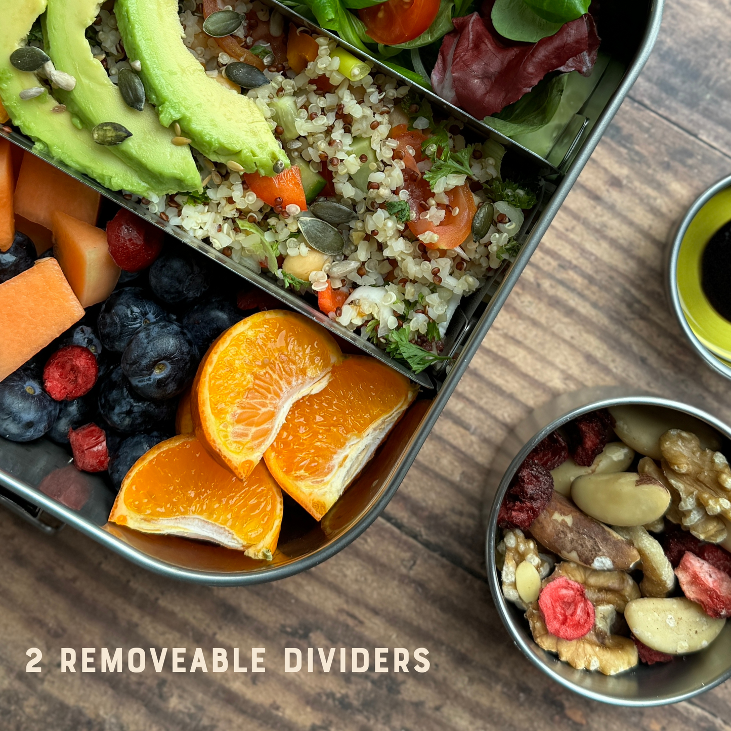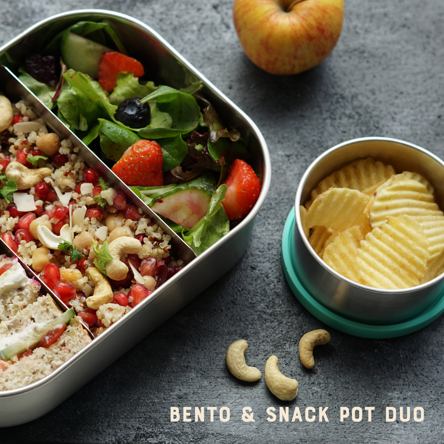 Our largest 1.4L stainless steel bento lunch box lets you pack multiple meals with ease, thanks to two removable dividers for ultimate meal flexibility. Our accompanying stainless steel snack box is perfect for fruit, veggies, nuts, yoghurt, sauces and more!