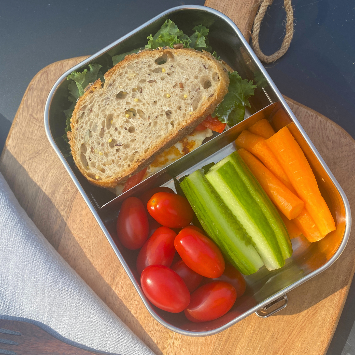 Our stainless steel lunch box with compartments can be securely fastened with zero risk of leaks. Snap for your snack pot!