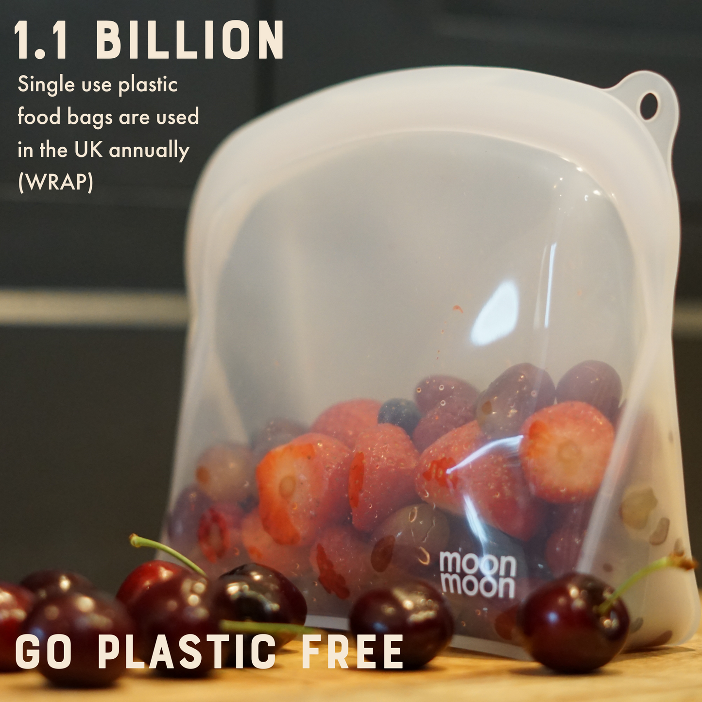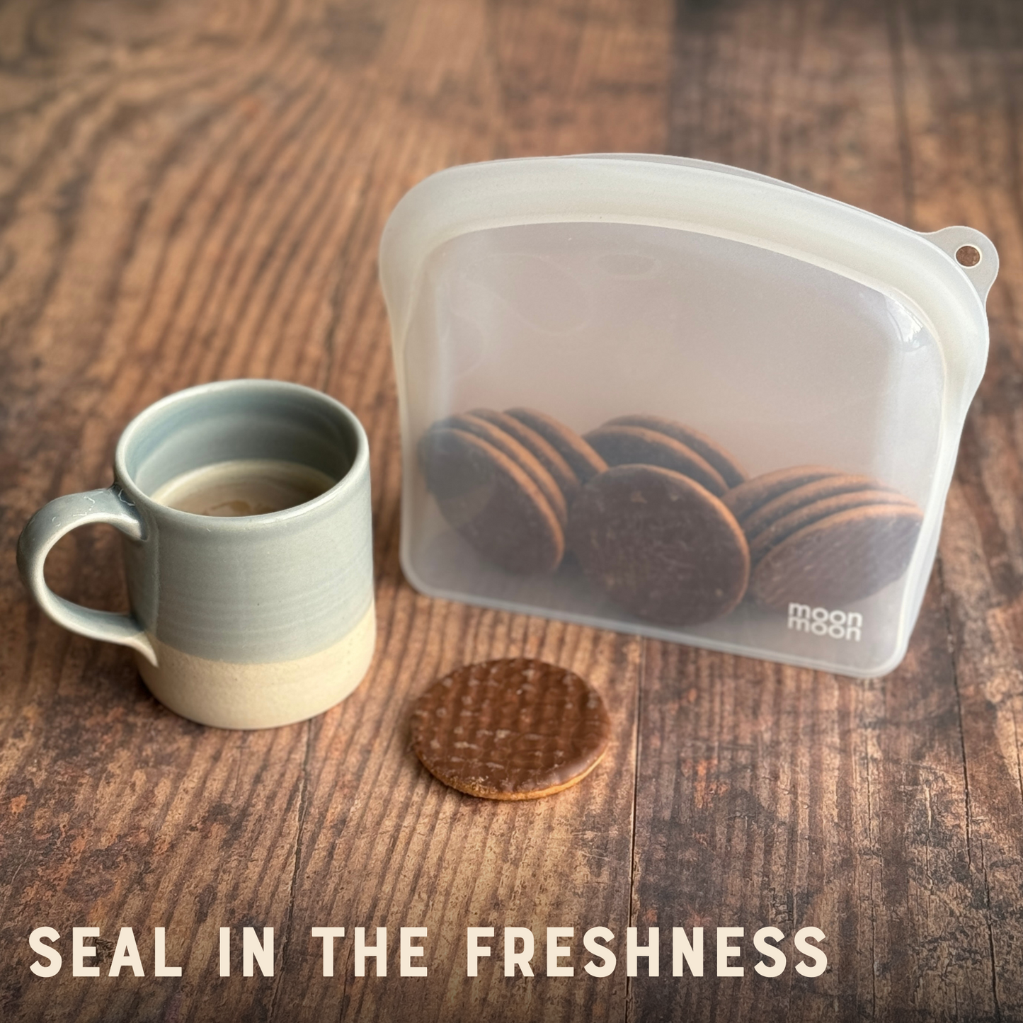 Say goodbye to single-use plastic with our set of 2 Platinum food-grade silicone bags (1200ml capacity), ideal for your sandwich, snack, or meal prep needs. Ditch the plastic ziplock bags and choose durable and reusable moonmoon bags, helping you reduce waste and keep your kitchen organised