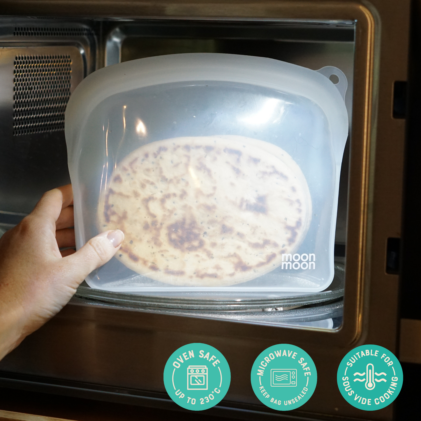 Made from BPA-free, FDA-approved silicone, moonmoon bags are ideal for sandwiches, snacks, and more, providing a healthy and sustainable food storage option. Safely heat your food in moonmoon bags in the microwave, a reusable and non-toxic alternative to plastic.