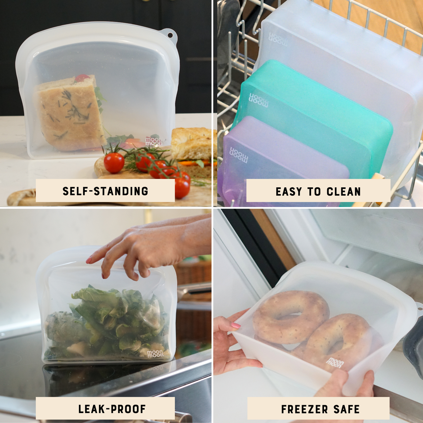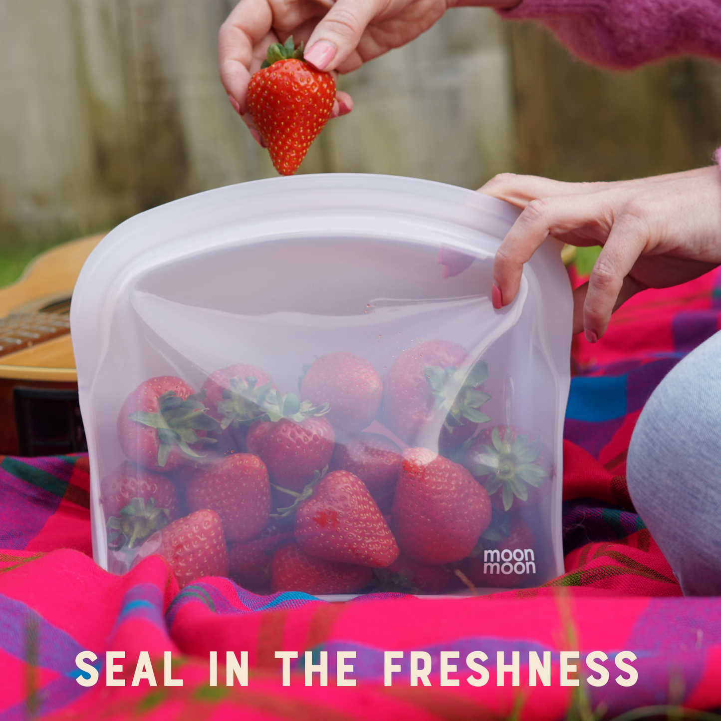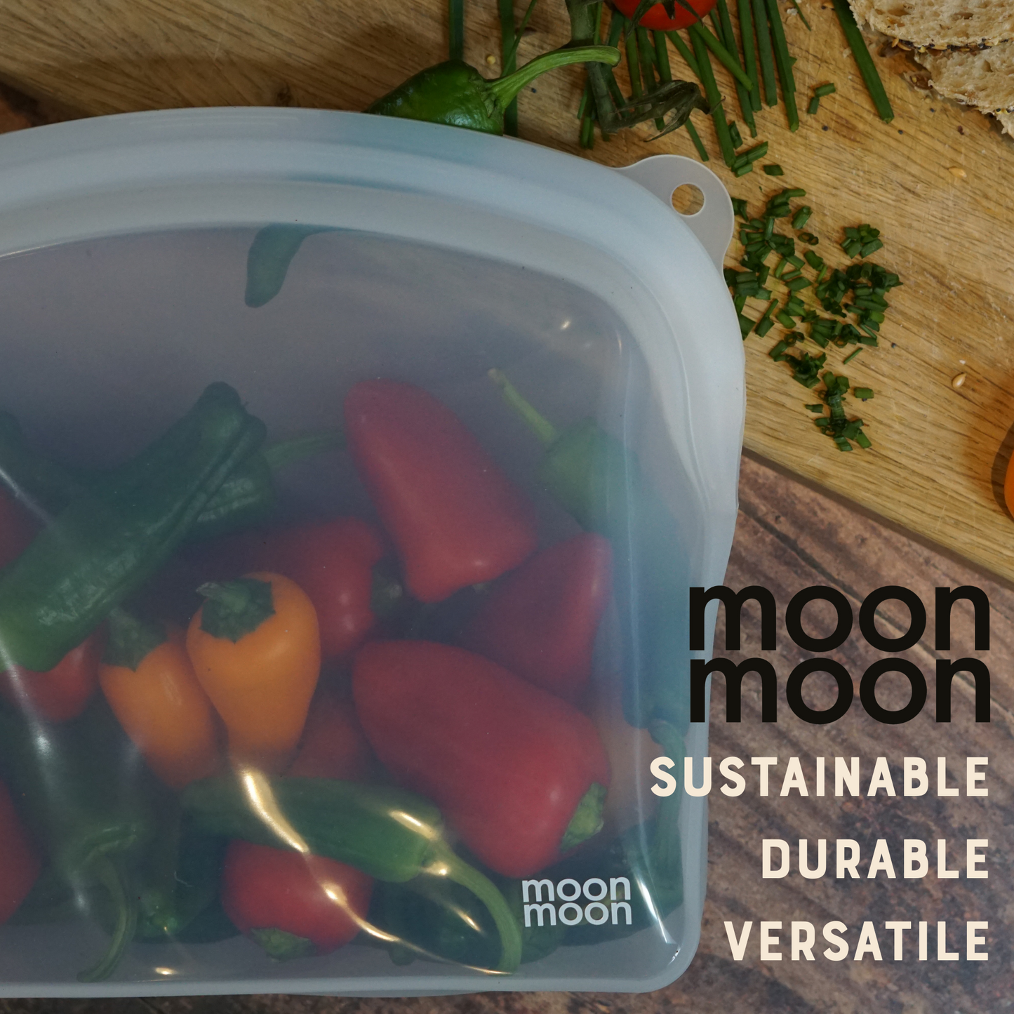Say goodbye to single-use plastic ziploc bags with our set of 2 Platinum food-grade silicone bags (2000ml each) – the biggest in the moonmoon range. Perfect for meal prep, batch cooking and keeping your food fresh. Reduce waste and keep your kitchen beautifully organised.