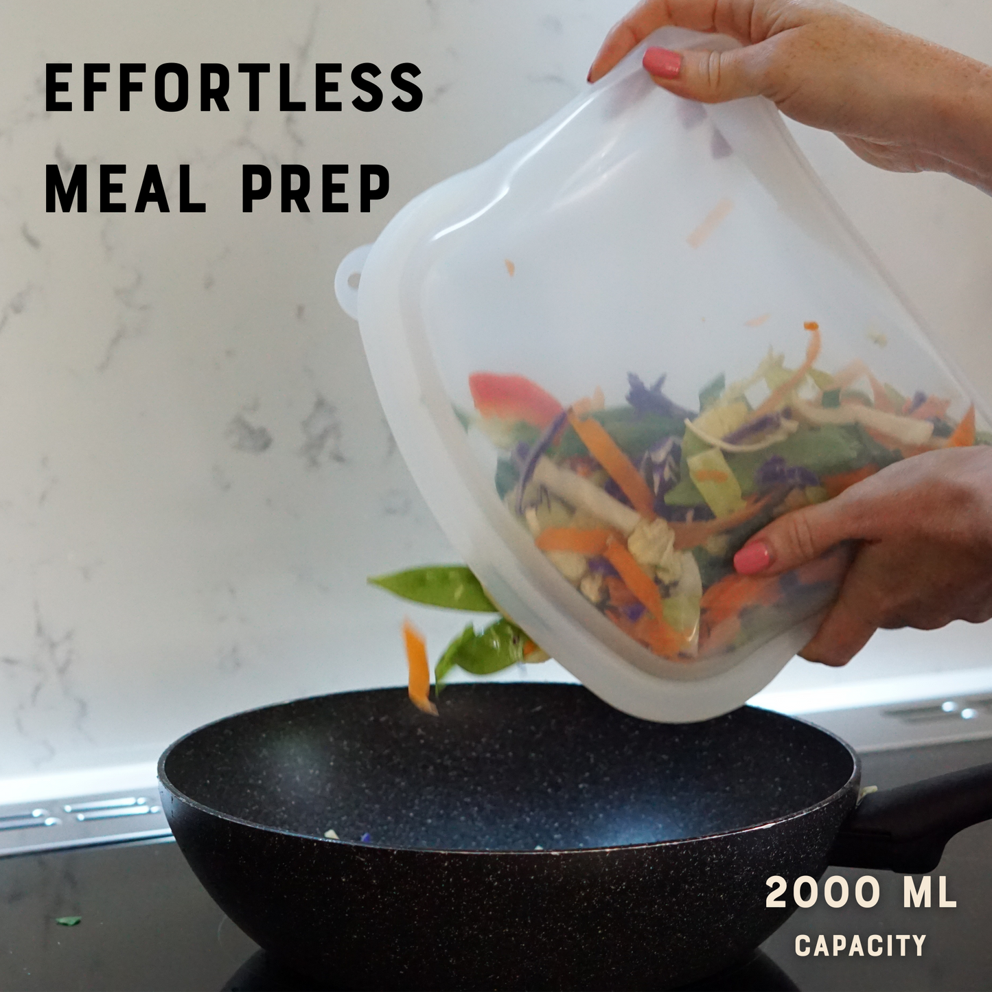 Simply seal and store your fresh or frozen ingredients in our extra large reusable silicone bags. Makes meal prep a doddle!