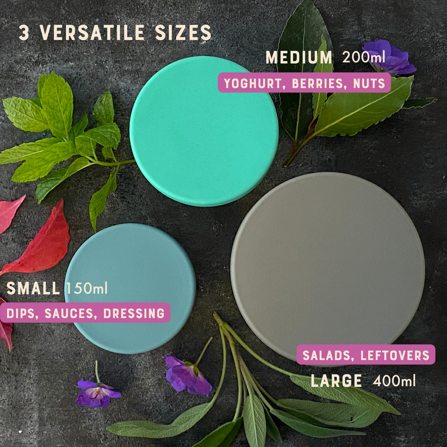 Our stainless steel food containers come in 3 handy sizes (150ml, 200ml, 400ml). Use for kitchen storage or for non-food items such as jewellery. Perfect for meal prep, freezing leftovers or as weaning pots. Use the larger size for packed lunches. The smaller sizes can fit inside your lunch box for dips, dressing, sauces and yoghurts. Eat healthier and save money, by preparing your food in advance.